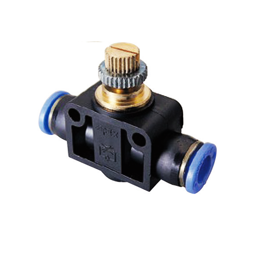 Regulador de caudal neumaticos Sang-A con racor de conexion a tubo flexible, apto para todas las aplicaciones de regulación de caudal y velocidad de cilindros neumáticos. Ofrece una regulación fina, perfecta estanqueïdad y calidad certificada Sang-A. Presión de trabajo: 9 bar. Unidireccional. Regulador de gran precisión. Regulación de la rosca hacia tubo (R-D) (cilindro). Cuerpo de resina acetálica. Partes metálicas en latón niquelado.