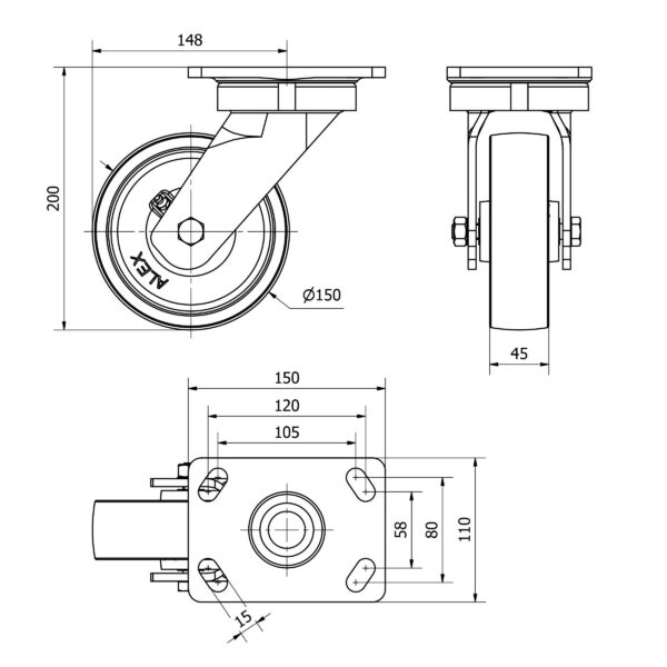 Rueda acero giratoria Alex diametro 150 mm. modelo 4-1133