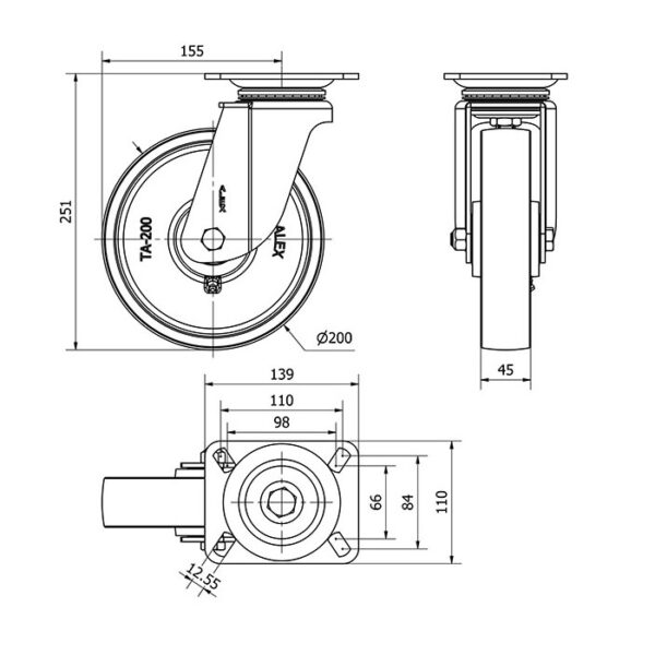 Rueda acero giratoria Alex diametro 200 mm. modelo 2-1574