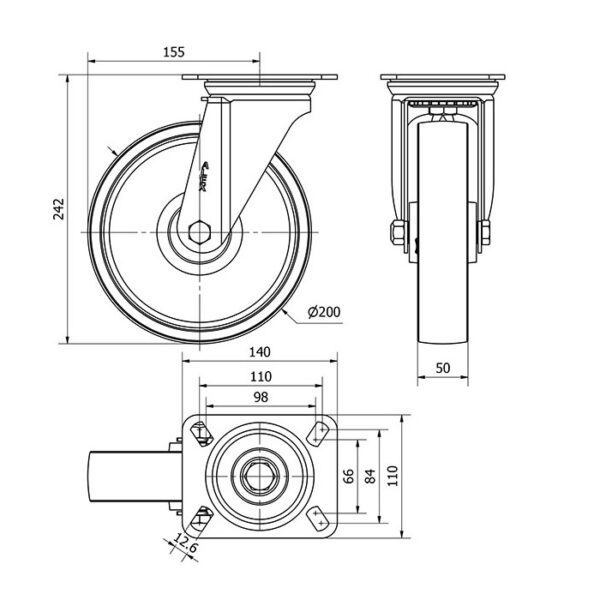 Rueda acero giratoria Alex diametro 200 mm. modelo 2-2516 EAN 8422202225166