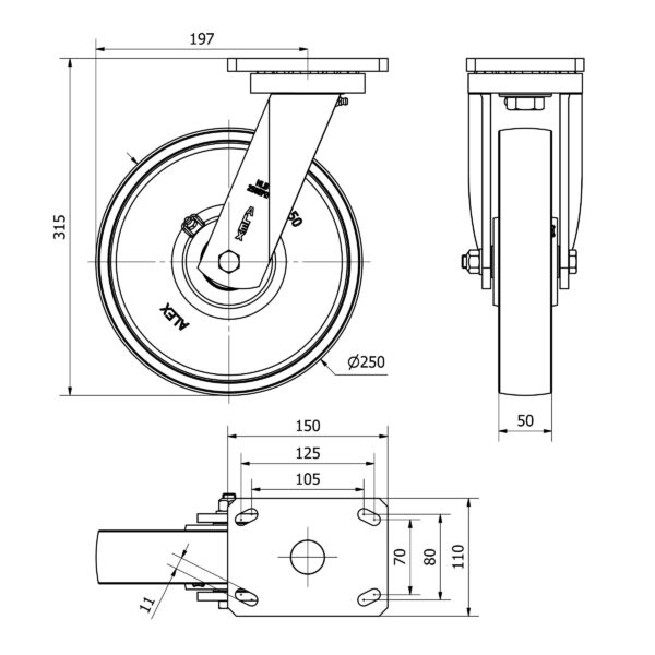 Rueda acero giratoria Alex diametro 250 mm. modelo 2-2303