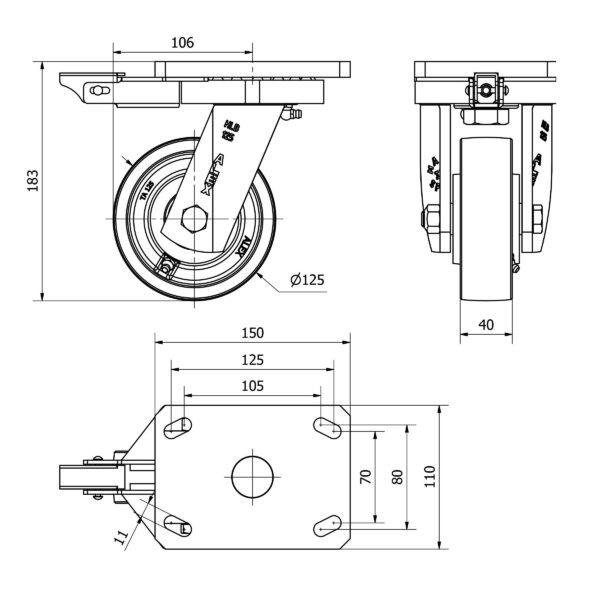 Rueda acero giratoria con bloqueo direccional Alex diametro 125 mm. modelo 2-3388