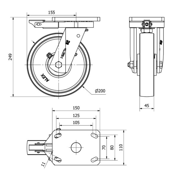 Rueda acero giratoria con bloqueo direccional Alex diametro 200 mm. modelo 2-3392