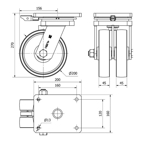 Rueda acero giratoria con bloqueo direccional Alex diametro 200 mm. modelo 2-3838