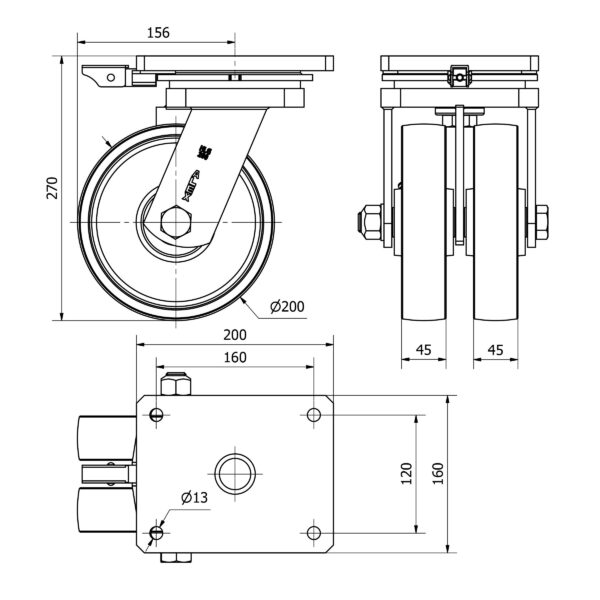Rueda acero giratoria con bloqueo direccional Alex diametro 200 mm. modelo 2-3841