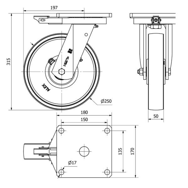 Rueda acero giratoria con bloqueo direccional Alex diametro 250 mm. modelo 2-3394