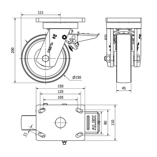 Rueda acero giratoria con freno Alex diametro 150 mm. modelo 2-1540