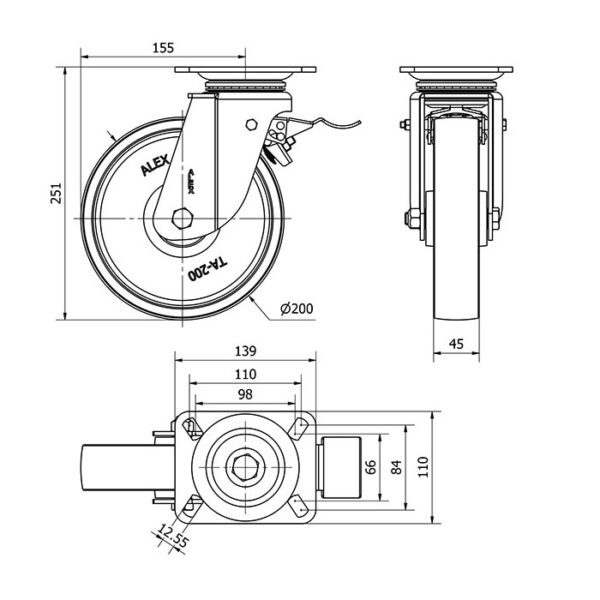Rueda acero giratoria con freno Alex diametro 200 mm. modelo 2-0960