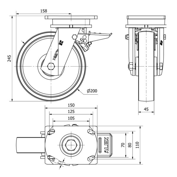 Rueda acero giratoria con freno Alex diametro 200 mm. modelo 2-3700