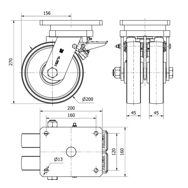 Rueda acero giratoria con freno Alex diametro 200 mm. modelo 2-3823