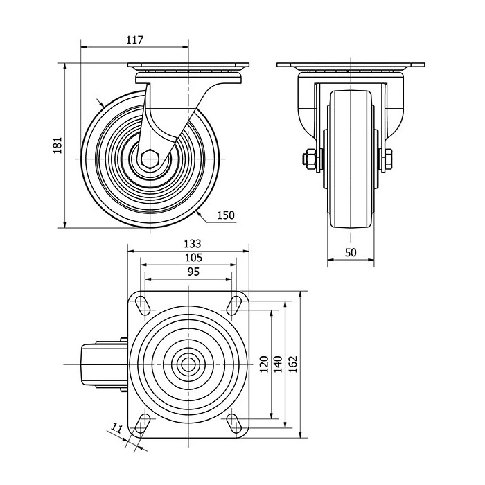 La serie de ruedas Alex 61-HG son ruedas con el núcleo de acero y banda de goma negra natural, indicadas para soportar cargas hasta 400 Kg. Se utilizan en útiles de transporte logístico, talleres, logística interna y plataformas elevadoras, especialmente en sectores industriales. HG: ruedas apropiadas para tracción mecánica y manual en la industria en general, silenciosas.