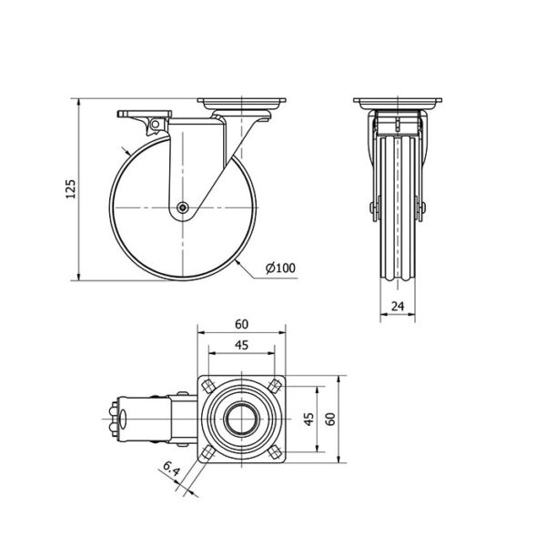 Rueda aluminio giratoria con freno Alex diametro 100 mm. modelo 1-0540