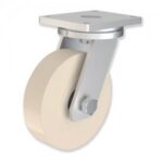 UPF: Rotantes modelo U, sujeción por pletina P y fijos. Soportes de acero (estampado) y electrosoldado. Sujeción de los soportes por pletina de 4 agujeros. Horquilla provista de tornillo y tuerca autoblocante (calidad 8.8): DIN 933 M-25×140 mm. Casquillos de montaje encajados en los cojinetes. Acabados: zincado brillante. Cabeza giratoria de acero forjado y mecanizado, conformada por un rodamiento de bolas de presición (DIN 711) encajado en la pletina y un rodamiento de rodillos cónicos (DIN 720) encajado en la cabeza giratoria, rellena de grasa (totalmente sellada) y provista de engrasador. Robusto pivote central forjado de una pieza con la pletina. Blocaje de la cabeza giratoria por tuerca almenada y pasador que permite el ajuste del juego sin tener que desmotar la rueda. Horquilla de acero estampado electrosoldada (interior y exterior) a la cabeza giratoria.
