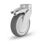 LTG: Rotantes modelo L con sujeción por tornillo y giratorios. Sujeción del soporte por tornillo M-12. Soporte de acero estampado de 2,5 mm. de espesor. Rodamiento rigido de bolas en la cabeza giratoria. Incorporan parachoques color gris claro. Acabado del soporte: partes metálicas zincado brillante