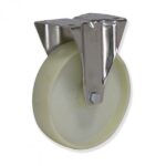 MIPG: Rotantes modelo M en acero inoxidable, con sujeción por pletina y giratorios. Soportes de acero inoxidable AISI-304 al niquel-cromo 18/8. Sujeción de los soportes por pletina de 4 agujeros. Horquilla provista de tornillo y tuerca autoblocante inoxidables A2. Acabados: Pulido brillante. Doble hilera de bolas (de acero inoxidable AISI 420B) protegidas por cazoletas envolventes y junta de retención de grasa. Robusto pivote central (remachado) de acero inoxidable AISI 305.