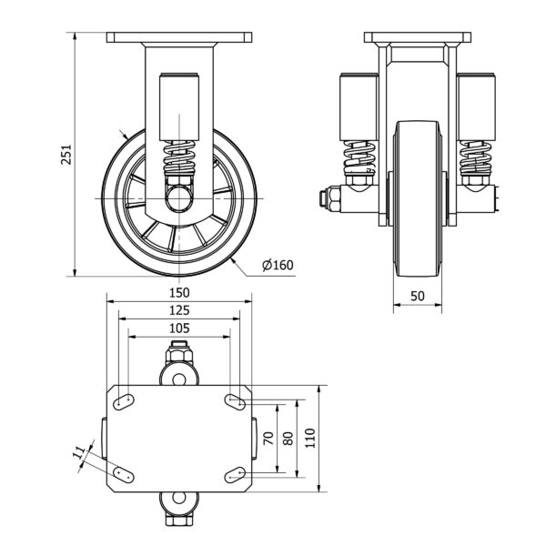 Las ruedas Alex serie HLS-DE son ruedas con el núcleo de aluminio y con la banda de goma negra elástica con una dureza 70? shore A, indicadas para soportar altas cargas hasta 500 Kg. Con soporte de suspensión elástica, mediante incorporación de muelle muy resistente, ideal para suelos irregulares donde su amortiguación actúa. Se utilizan en logística interna, útiles de transporte, aéreas de exteriores, gradas móviles, plataformas elevadoras, carros de transporte, maquinaria pesada y grúas móviles. DE: ideal para el traslado manual de cargas medianas. Silenciosa. Absorbe golpes y vibraciones. Máxima protección de los suelos y del equipo. Ideal para suelos irregulares.