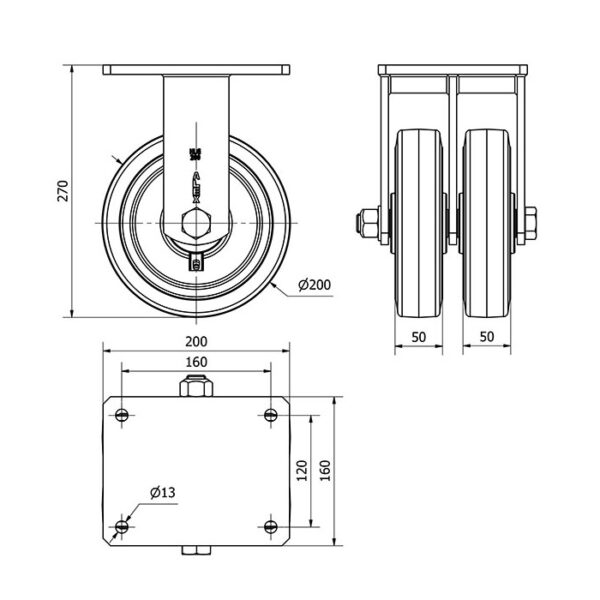 Rueda goma fija Alex diametro 200 mm. modelo 2-1857 EAN 8422202218571 n nHOJA TECNICA n nLas ruedas Alex serie HLG-HG son ruedas con doble núcleo de acero y banda de goma negra natural, indicadas para soportar altas cargas de hasta 1.400 Kg. Se utilizan en útiles de transporte logístico, gradas móviles, grúas que transportan materiales pesados, así como plataformas elevadoras, principalmente en el sector aeronáutico, ferroviario y automoción. HG: Ruedas apropiadas para tracción mecánica. Máxima protección de los suelos. Rodadura suave y silenciosa. Industria en general.