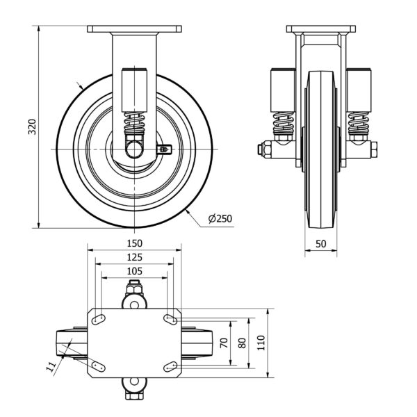 Las ruedas Alex serie HLS-HG son ruedas con el núcleo de acero y con la banda de goma negra natural, indicadas para soportar altas cargas hasta 700 Kg. Con soporte de suspensión elástica, mediante incorporación de muelle muy resistente, ideal para suelos irregulares donde su amortiguación actúa. Se utilizan en útiles de transporte logístico, aéreas de exteriores y grúas móviles. HG: Rueda apropiada para tracción mecánica. Máxima protección de los suelos. Rodadura suave y silenciosa. (Carretillas elevadoras, remolques, etc.). Industria en general.