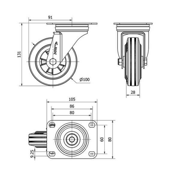 Rueda goma giratoria Alex diametro 100 mm. 2-0999