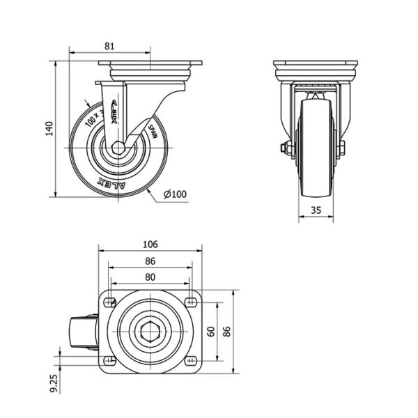 Rueda goma giratoria Alex diametro 100 mm. 2-1255
