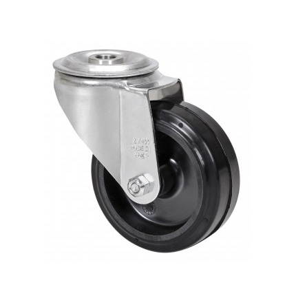 La serie de ruedas Alex ZVI INOX-THG son de goma negra, indicadas para soportar temperaturas de hasta 250ºC. en intervalos de 30 minutos y cargas hasta 100 Kg., con todos los elementos de acero inoxidable (AISI-304). Se utilizan en hornos, maquinaría ligera, en sectores industriales, aeronáutico y automoción, alimentación, maquinas vending, maquinaria para panaderías, maquinaría ligera, contenedores y construcciones inoxidables. THG: Ideal para el traslado manual de cargas medianas y de desplazamiento silencioso, con buena absorción de golpes y vibraciones. Máxima protección de los suelos y del equipo. Ideal para suelos irregulares.