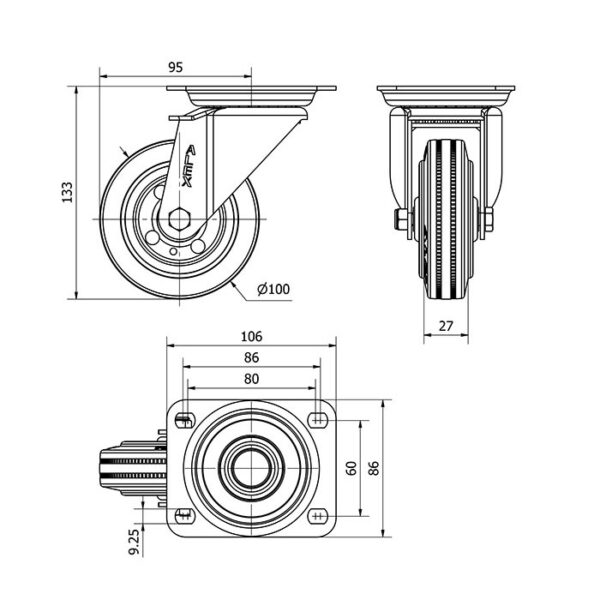 Rueda goma giratoria Alex diametro 100 mm. modelo 2-0225
