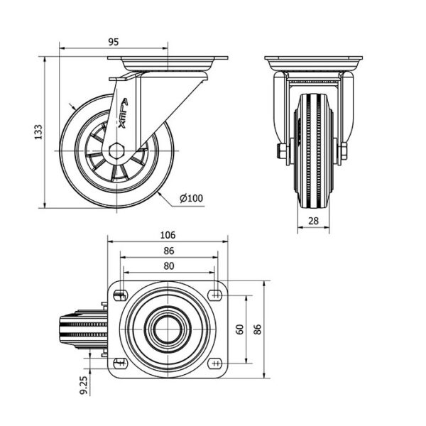 Rueda goma giratoria Alex diametro 100 mm. modelo 2-0858
