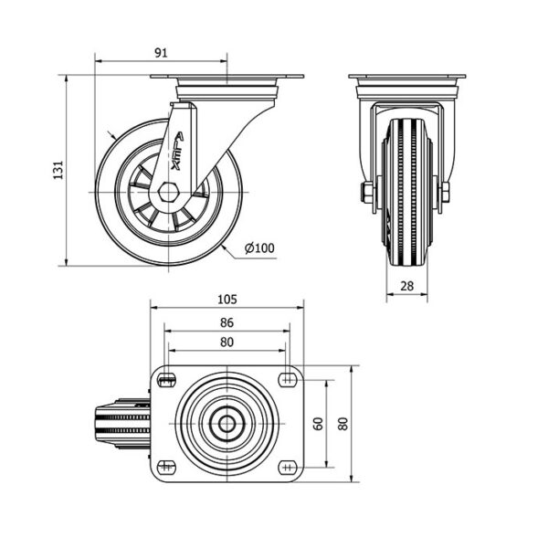 Rueda goma giratoria Alex diametro 100 mm. modelo 2-1841