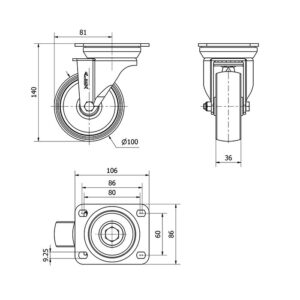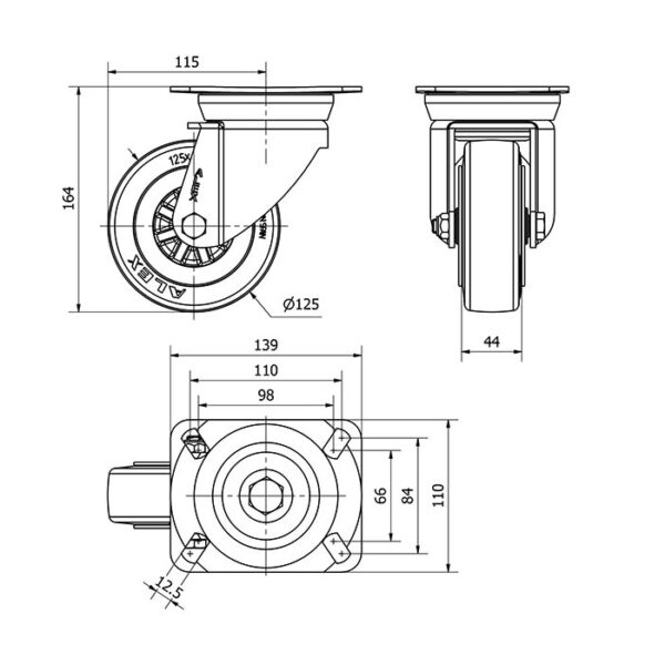 Rueda goma giratoria Alex diametro 125 mm. modelo 2-0003