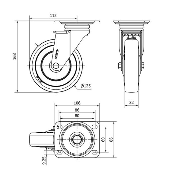 Rueda goma giratoria Alex diametro 125 mm. modelo 2-1127 EAN 8422202211275