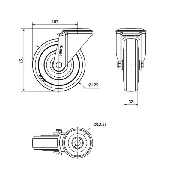 Rueda goma giratoria Alex diametro 125 mm. modelo 2-2406