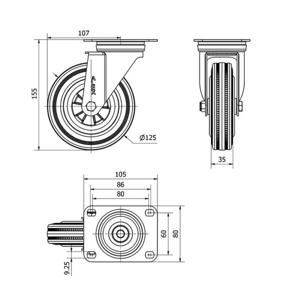 Rueda goma giratoria Alex diametro 125 mm. modelo 2-4843