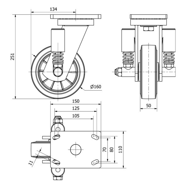 Rueda goma giratoria Alex diametro 160 mm. modelo 2-4406 EAN 8422202244068 n nHOJA TECNICA n nLas ruedas Alex serie HLS-DEGB son ruedas con núcleo de aluminio y banda de goma gris elástica con una dureza 70? shore A, indicadas para soportar altas cargas hasta 450 Kg. Con soporte de suspensión elástica, mediante incorporación de muelle muy resistente, ideal para suelos irregulares donde su amortiguación actúa. Se utilizan en útiles de transporte logístico, aéreas de exteriores, gradas móviles, plataformas elevadoras, carros de transporte, maquinaria pesada del sector de la construcción y grúas móviles. DEGB: indicada para el traslado manual de cargas medianas, silenciosa, no deja huella, absorbe golpes y vibraciones. Máxima protección de los suelos y del equipo. Ideal para suelos irregulares aplicaciones en industrias alimentarias, químicas y conserveras. No mancha el suelo. Extrafuerte.