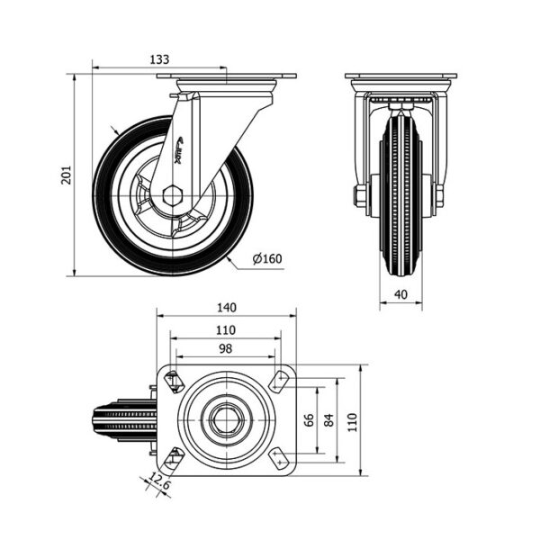 Rueda goma giratoria Alex diametro 160 mm. modelo 2-3400