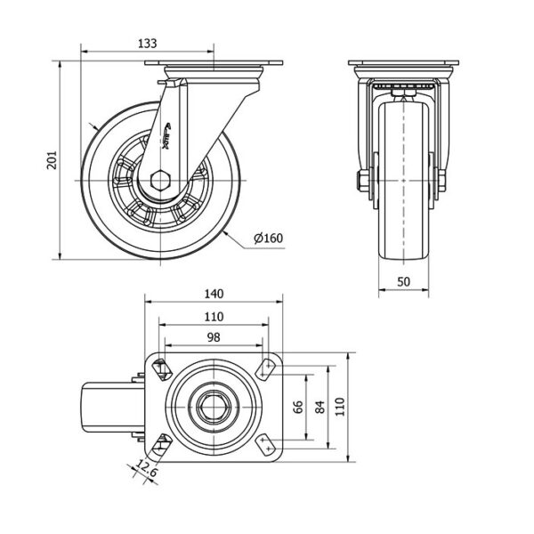 Rueda goma giratoria Alex diametro 160 mm. modelo 2-3924