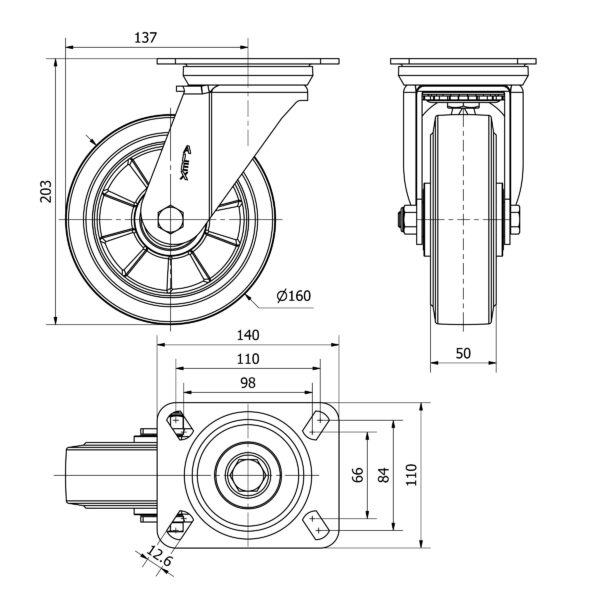 Rueda goma giratoria Alex diametro 160 mm. modelo 2-4372