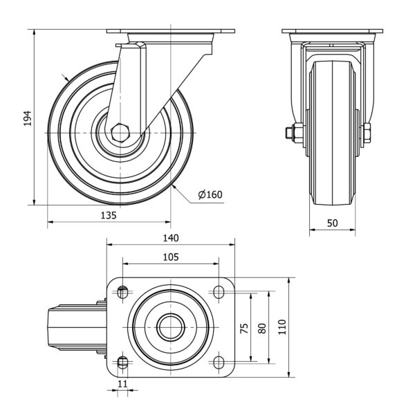 Rueda goma giratoria Alex diametro 160 mm. modelo TW0296 EAN 8422202002965