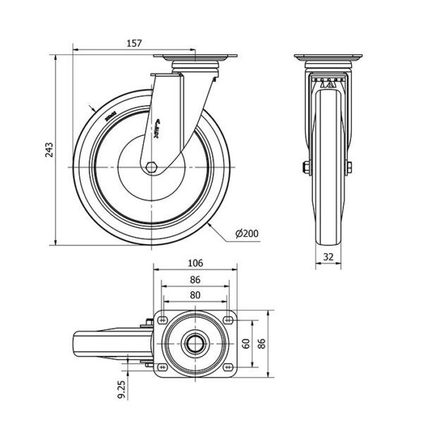 Rueda goma giratoria Alex diametro 200 mm. modelo 2-1565