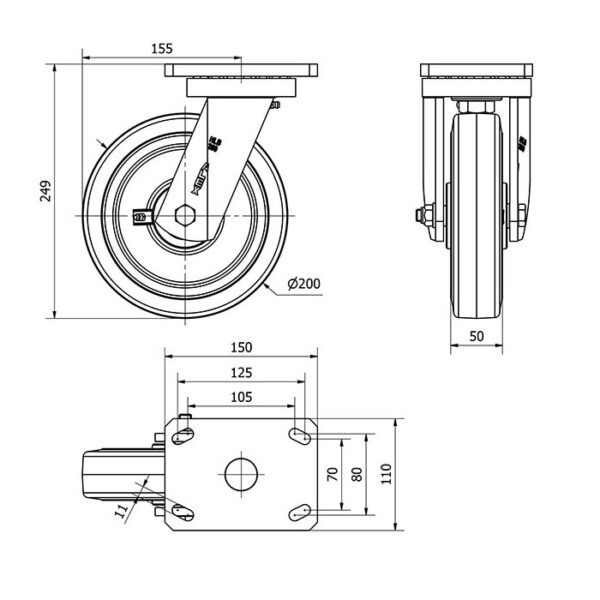 Rueda goma giratoria Alex diametro 200 mm. modelo 2-1952