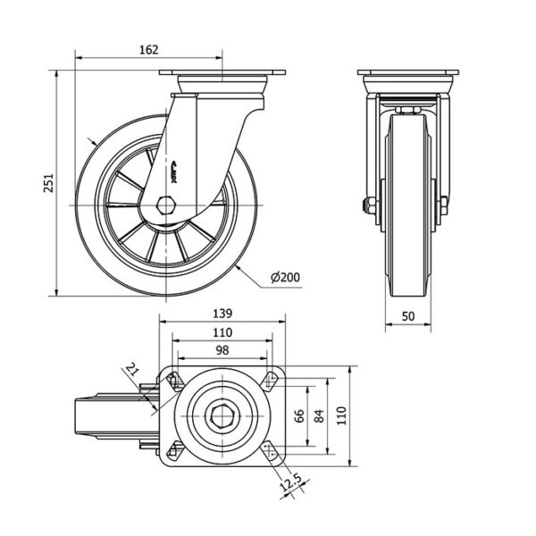 Rueda goma giratoria Alex diametro 200 mm. modelo 2-1994