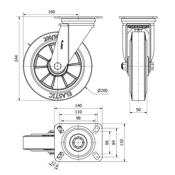 Rueda goma giratoria Alex diametro 200 mm. modelo 2-4376