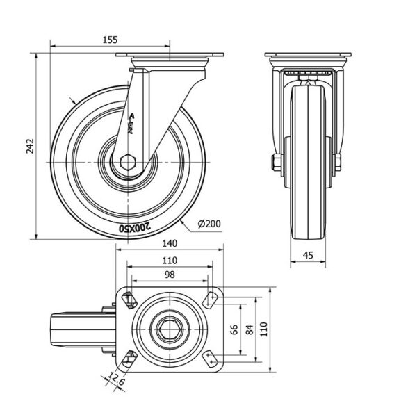 Rueda goma giratoria Alex diametro 200 mm. modelo 2-4468 EAN 8422202244686