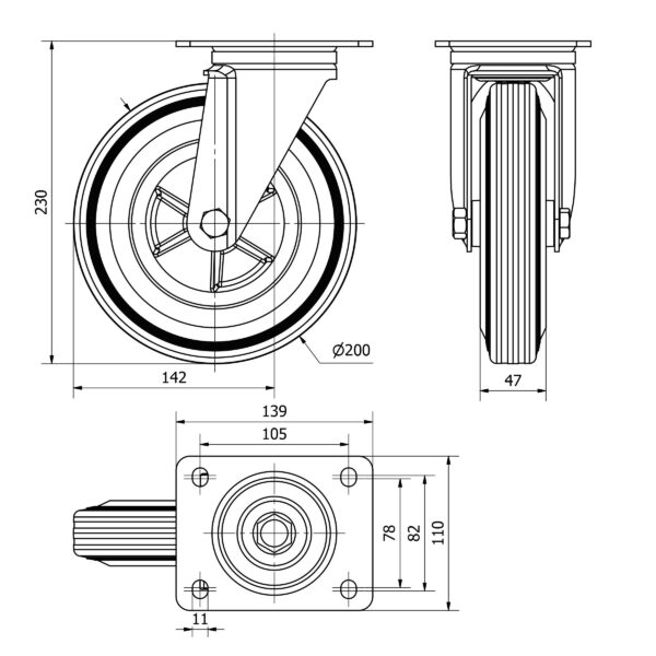 Rueda goma giratoria Alex diametro 200 mm. modelo TW0257