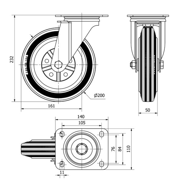 Rueda goma giratoria Alex diametro 200 mm. modelo TW0272