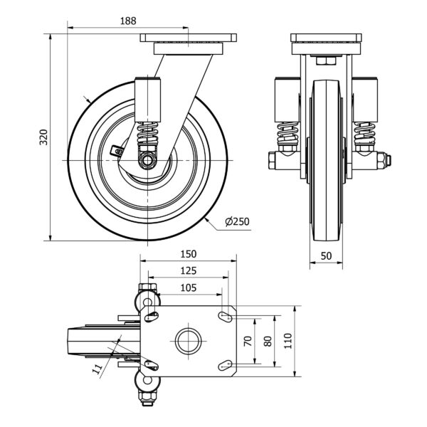 Rueda goma giratoria Alex diametro 250 mm. modelo 2-3187 EAN 8422202231877 n nHOJA TECNICA n nLas ruedas Alex serie HLS-HG son ruedas con el núcleo de acero y con la banda de goma negra natural, indicadas para soportar altas cargas hasta 700 Kg. Con soporte de suspensión elástica, mediante incorporación de muelle muy resistente, ideal para suelos irregulares donde su amortiguación actúa. Se utilizan en útiles de transporte logístico, aéreas de exteriores y grúas móviles. HG: Rueda apropiada para tracción mecánica. Máxima protección de los suelos. Rodadura suave y silenciosa. (Carretillas elevadoras, remolques, etc.). Industria en general.