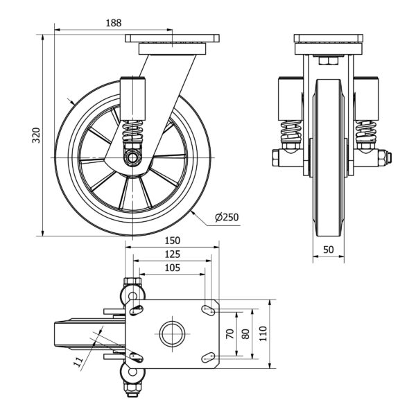 Las ruedas Alex serie HLS-DE son ruedas con el núcleo de aluminio y con la banda de goma negra elástica con una dureza 70? shore A, indicadas para soportar altas cargas hasta 500 Kg. Con soporte de suspensión elástica, mediante incorporación de muelle muy resistente, ideal para suelos irregulares donde su amortiguación actúa. Se utilizan en logística interna, útiles de transporte, aéreas de exteriores, gradas móviles, plataformas elevadoras, carros de transporte, maquinaria pesada y grúas móviles. DE: ideal para el traslado manual de cargas medianas. Silenciosa. Absorbe golpes y vibraciones. Máxima protección de los suelos y del equipo. Ideal para suelos irregulares.