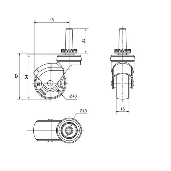 Rueda goma giratoria Alex diametro 40 mm. modelo 1-0290