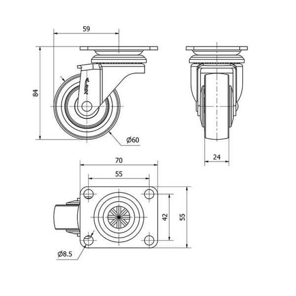 Rueda goma giratoria Alex diametro 60 mm. modelo 2-1034