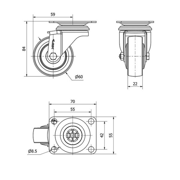 Rueda goma giratoria Alex diametro 60 mm. modelo 2-1327