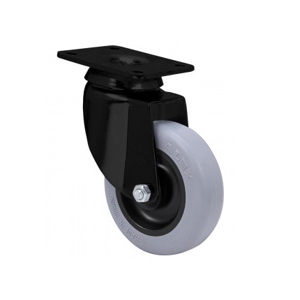 La serie de ruedas Alex BH-PGI NEGRA son de goma gris inyectada, indicadas para soportar cargas hasta de 60 kg. Fabricada con chapa pintada negra hasta 2 mm. de espesor. Se utilizan en supermercados, expositores, muebles, cajas apilables, taburetes, vitrinas, percheros, carros de hostelería, útiles para hospitales, mobiliario clínico sanitario y goteros, ya que no rallan ni dejan huella en el suelo y son muy silenciosas.